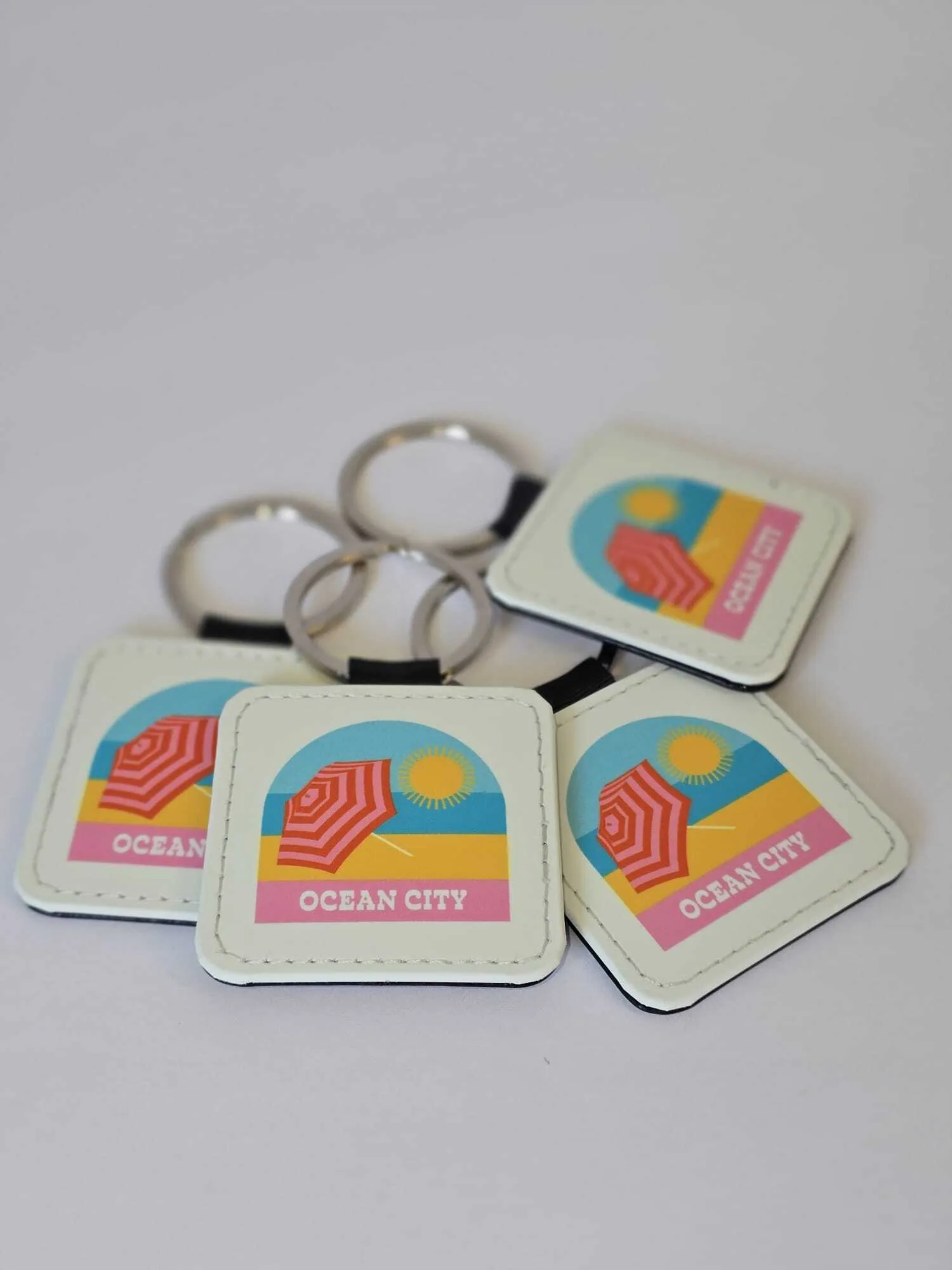 Carry a piece of the shore with you! This personalized Ocean City keychain features a fun beach umbrella design, perfect for adding a pop of color to your everyday essentials. Made with durable faux leather and a sturdy silver ring, it's a great way to show off your love for Ocean City